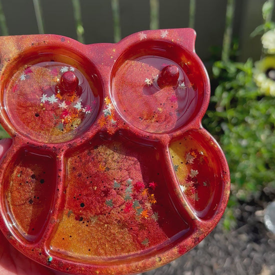"Add a touch of charm to your space with our handmade owl tray. Crafted with high quality resin and rich micas, it's perfect for storing statement pieces, jewelry, coins, crystals, and more. Elevate your organization game with this unique and functional piece."
