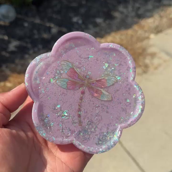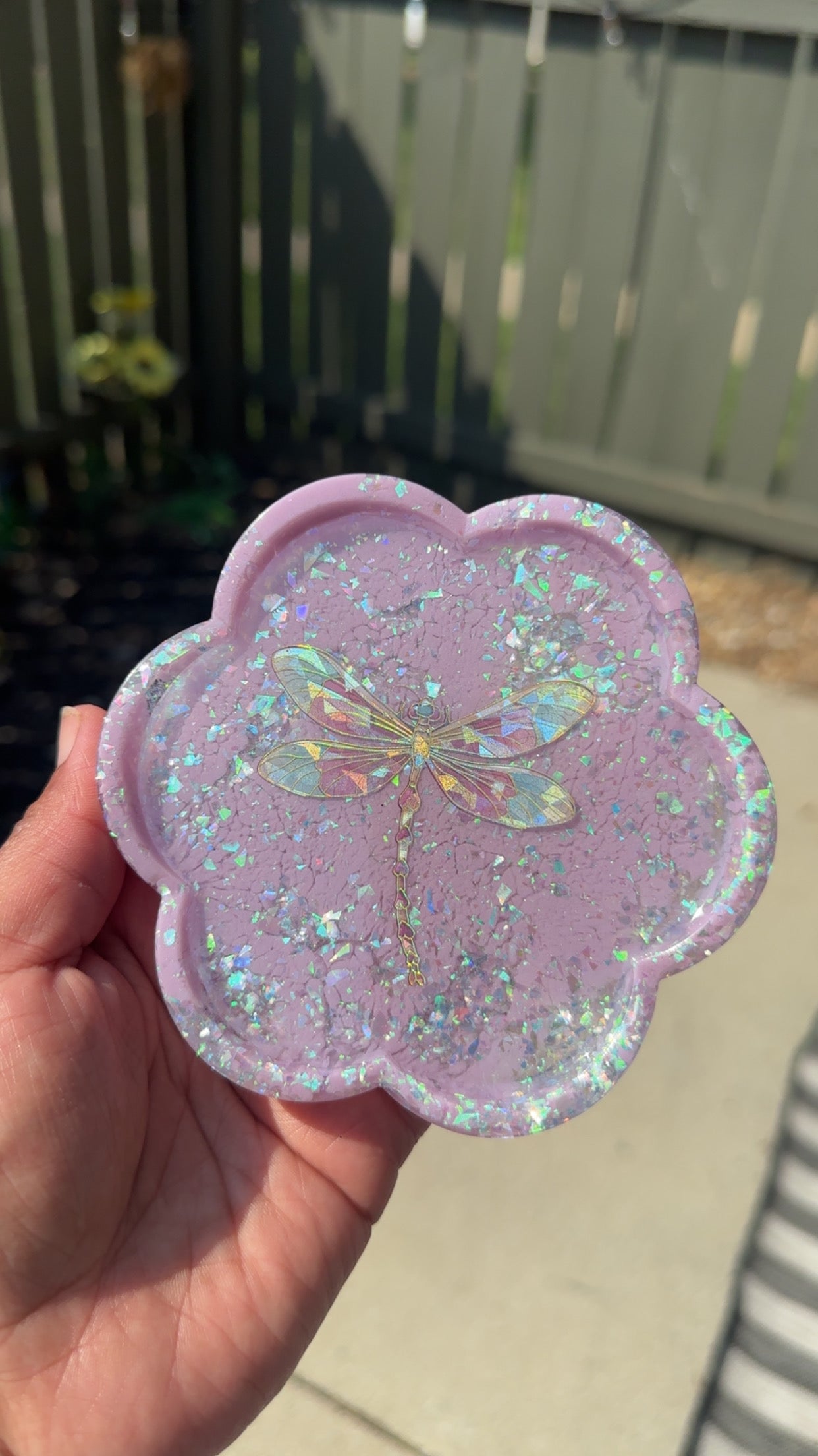 Expertly crafted and one-of-a-kind, the Dragonfly Fairy✨ trinket tray is adorned with a mesmerizing holographic dragonfly. Its charming design evokes images of fairies and adds a touch of magic to any room. Handmade with care, this tray is both functional and enchanting.