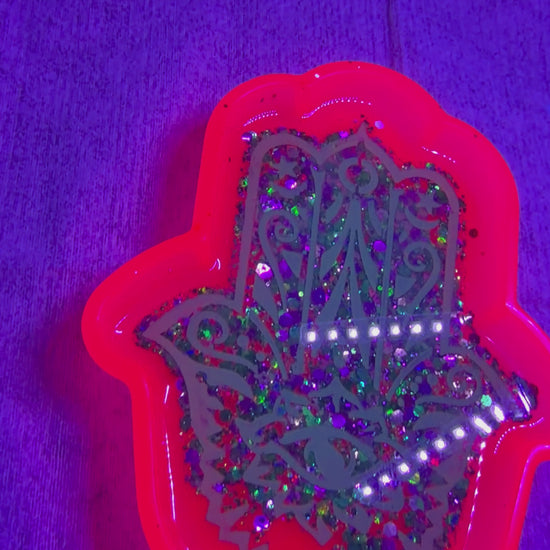 Expertly crafted with vibrant pigment paste, our Dragonfruit Hamsa Dish adds a radiant glow to any room. Handmade and adorned with sparkling glitter, it's the perfect addition to your decor. Illuminate your space with this unique, UV light-reactive piece.