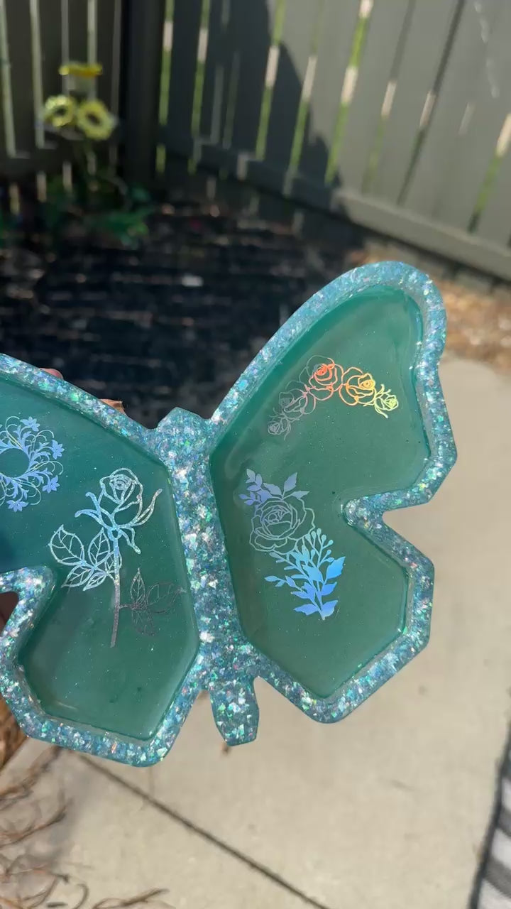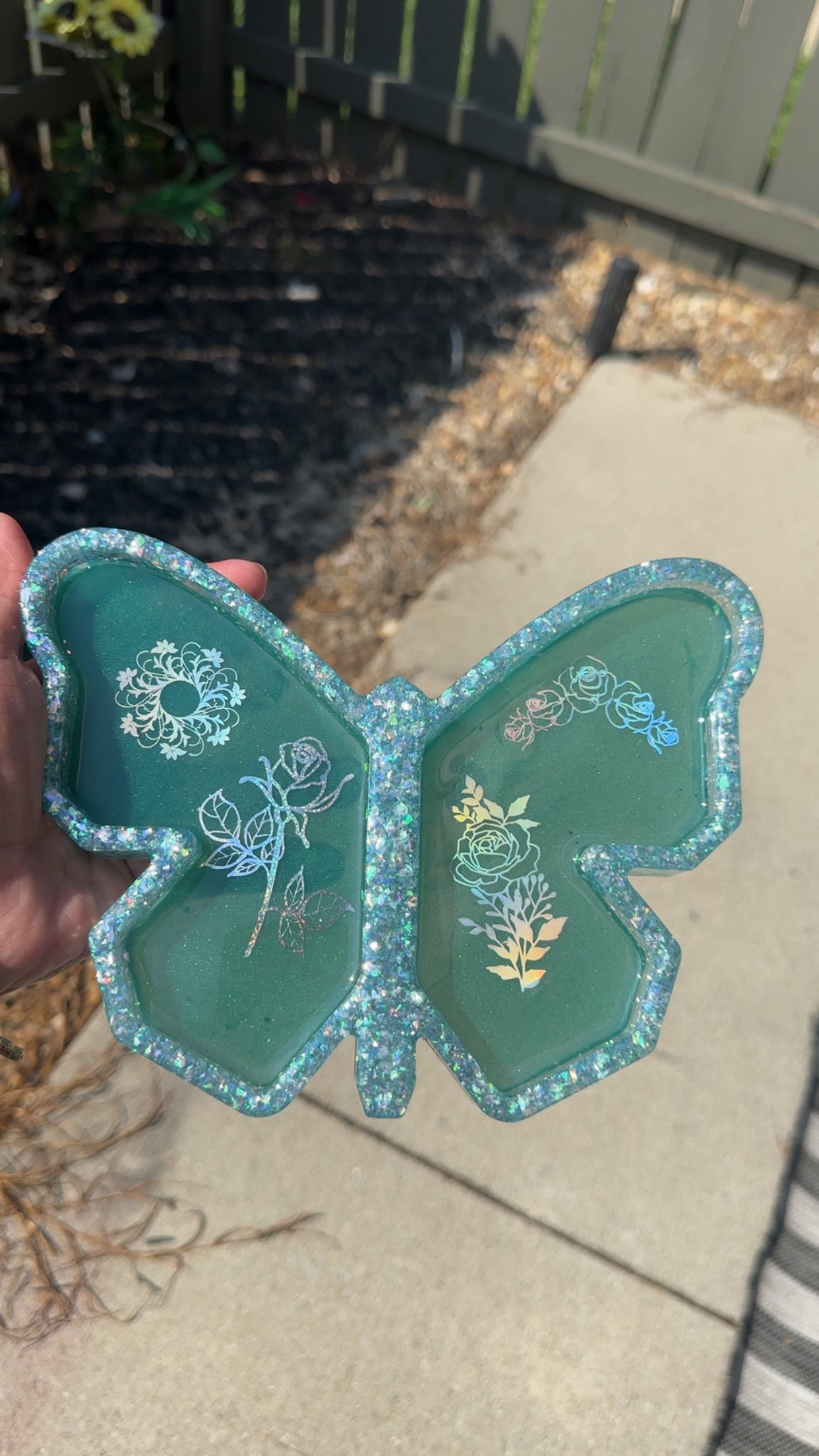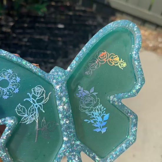 Step into a world of magic with our Enchanted Bloom Butterfly Tray. This handmade beauty glows in a soft light teal green, kissed with fairy holographic glitter that dances in the light. Accented with holographic flower stickers, it shimmers with whimsical charm from every angle. Perfect as a jewelry holder, trinket dish, or decorative accent, this butterfly tray brings a touch of sparkle and enchantment to any space. A dreamy piece for anyone who loves fairies, florals, and a little everyday magic.