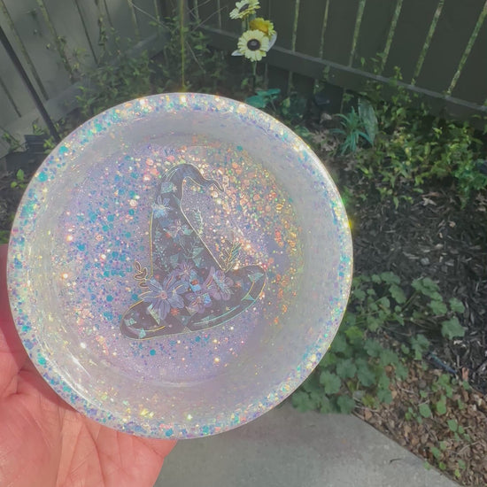 Bring a touch of magic into your space with this handmade resin bowl, crafted with shimmering holographic glitter and soft white pigment paste for a dreamy, celestial glow. At the center lies a holographic witch hat adorned with delicate flowers, creating a mystical focal point that radiates charm. Perfect as a trinket dish, decorative accent, or altar piece, this bowl is as functional as it is enchanting. Each one is uniquely crafted with love, ensuring no two are ever the same.