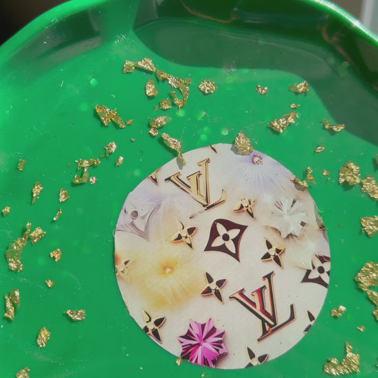 This handmade luxury green plate is crafted with rich pigments and accented with gold foils, bringing an elegant touch to any dining experience. The LV sticker adds a unique and sophisticated touch to this expertly crafted piece. Elevate your dining with this exquisite plate.