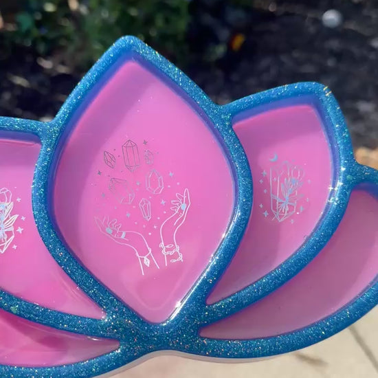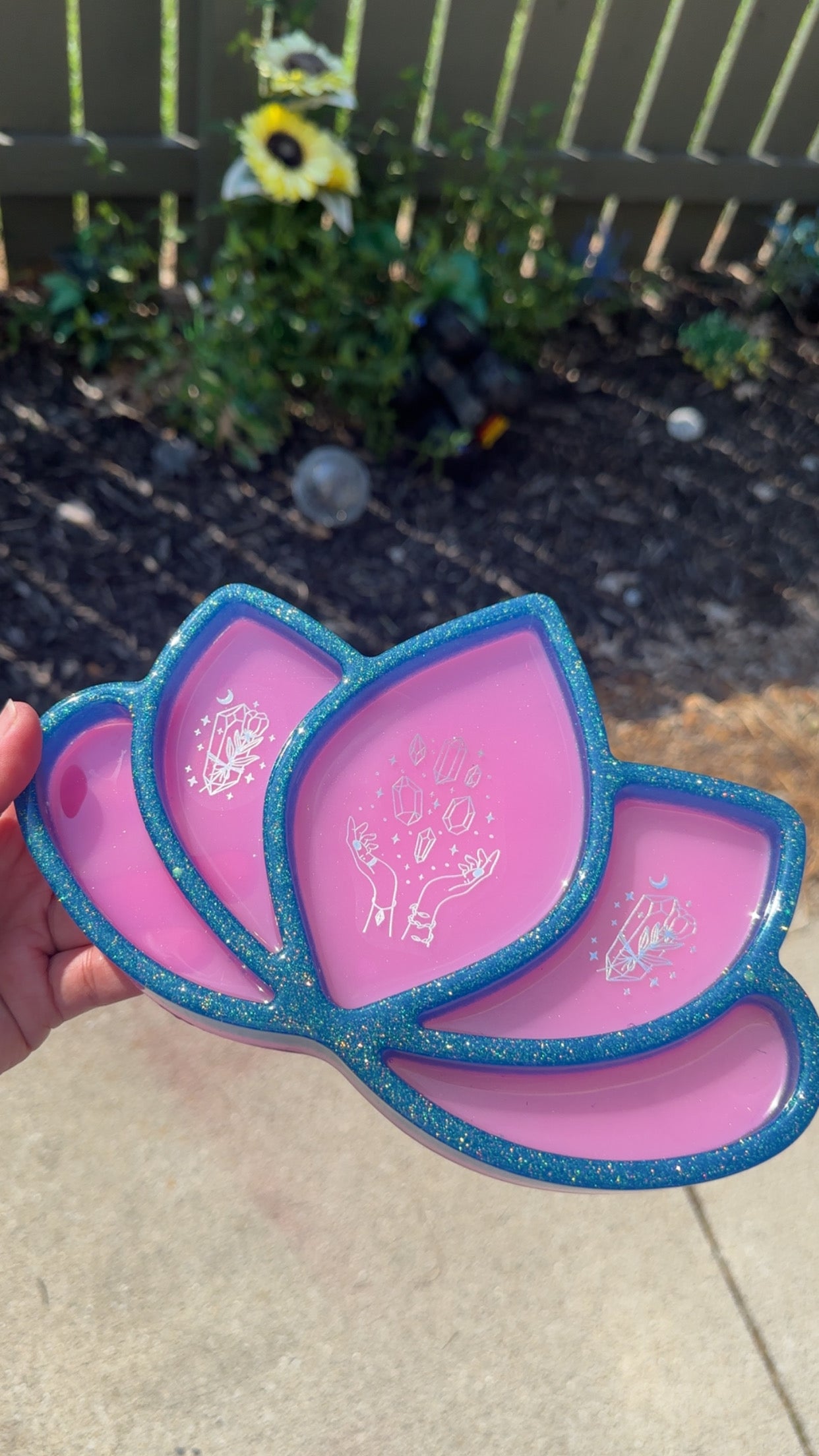 Bring a touch of enchantment into your space with the Mystic Aura Lotus Tray. Handcrafted in dreamy shades of pink and bluish teal, this one-of-a-kind piece is adorned with mystical hand and crystal designs that radiate magical energy. Perfect for holding jewelry, candles, makeup, or simply serving as a captivating décor accent, this tray is sealed in resin for lasting beauty and charm. A must-have for anyone who loves a little everyday magic.