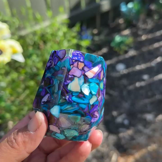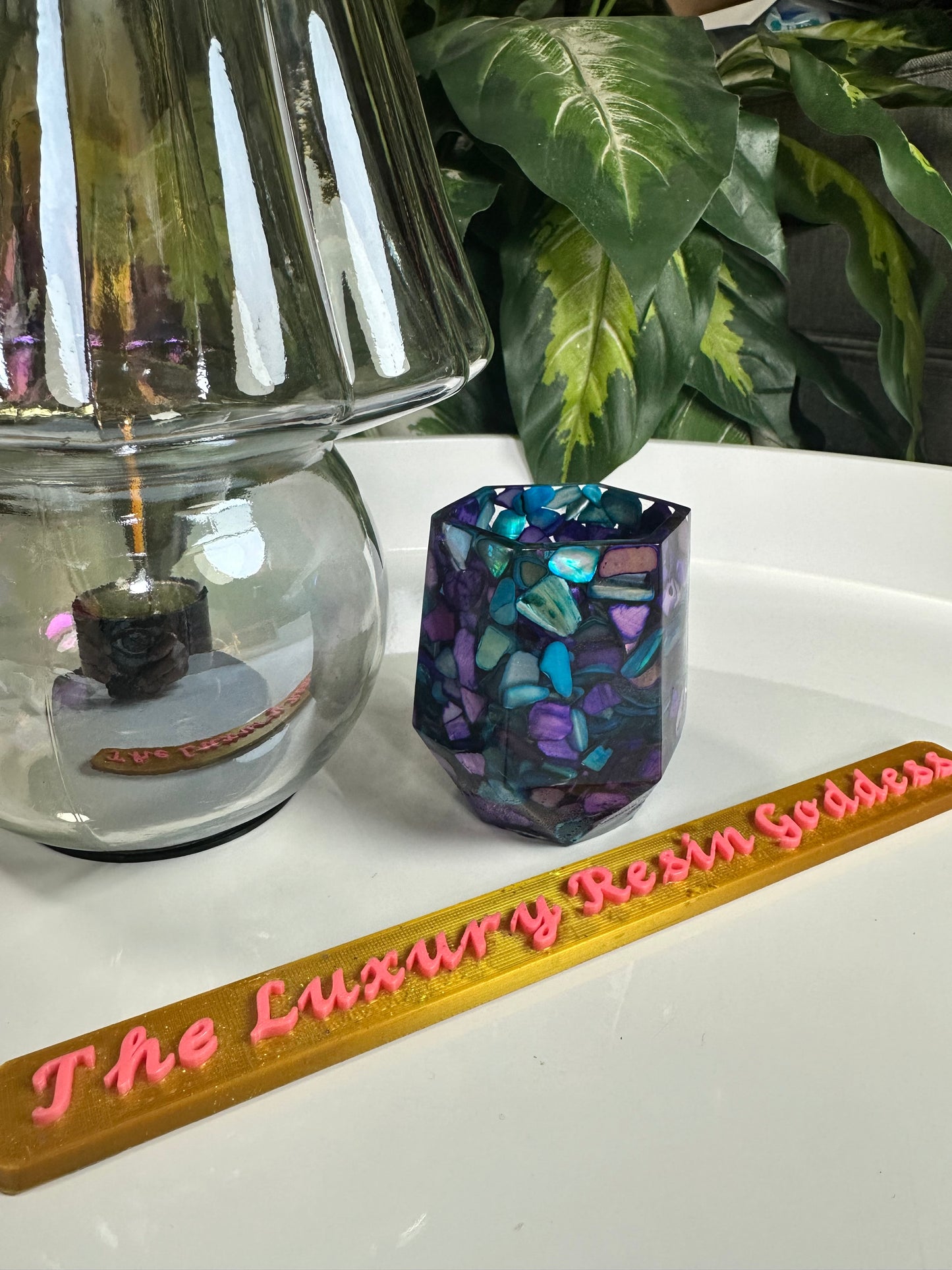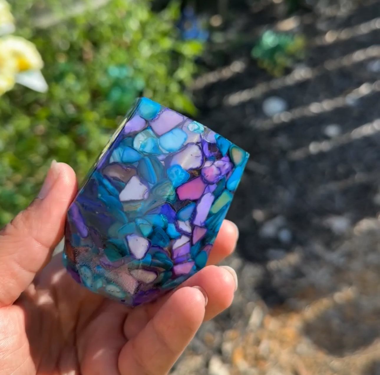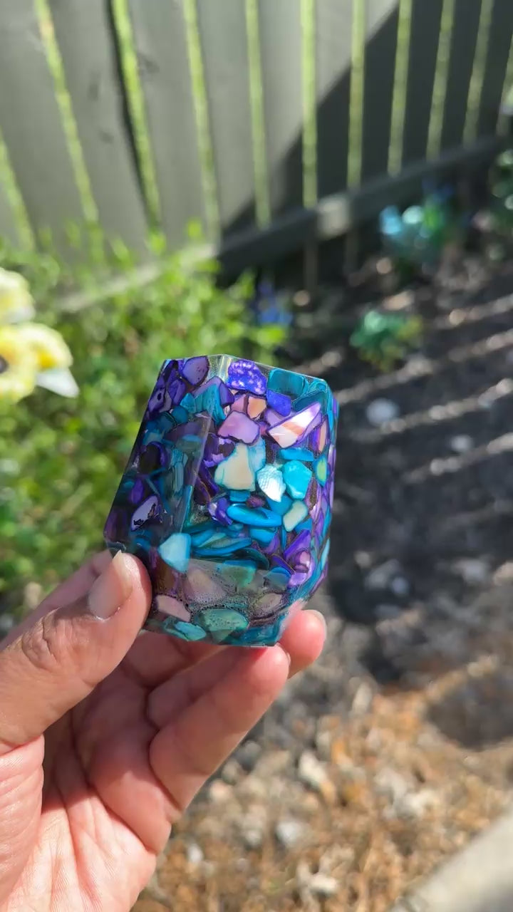 Discover the elegance of the Mystic Gemstone Jar, a handmade resin piece infused with vibrant stones that shimmer with natural beauty. Each jar is uniquely crafted, featuring an enchanting blend of purples, blues, teals, and soft pinks that mimic the look of polished gemstones. Perfect as a decorative accent, storage for jewelry, crystals, or small treasures, this jar radiates a luxurious and mystical energy.