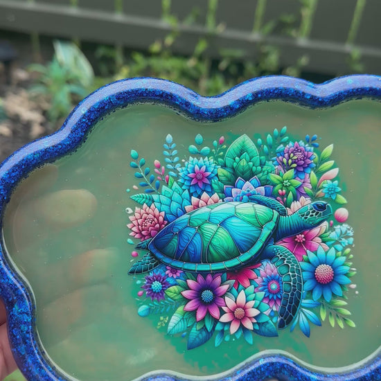 Bring the beauty of the sea and nature into your home with this handmade Ocean Blossom Turtle Tray. Featuring a stunning sea turtle surrounded by vibrant floral blooms, this one-of-a-kind resin piece is finished with a shimmering blue edge for an elegant touch. Perfect as a decorative tray, jewelry holder, or statement piece, this tray is both functional and enchanting—sealed in resin for lasting beauty and durability.