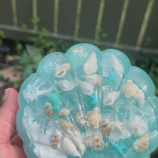 Bring the beauty of the sea into your home with this one-of-a-kind Ocean Treasures Shell Case. Handmade with love, this enchanting piece features a base crafted from soft white sand infused with a touch of twinkle dust for just the right amount of sparkle. The shimmering lid is adorned with seashells, starfish, miniature turtles, and a sprinkle of glitter, all set in vibrant alcohol ink that captures the magic of the ocean.