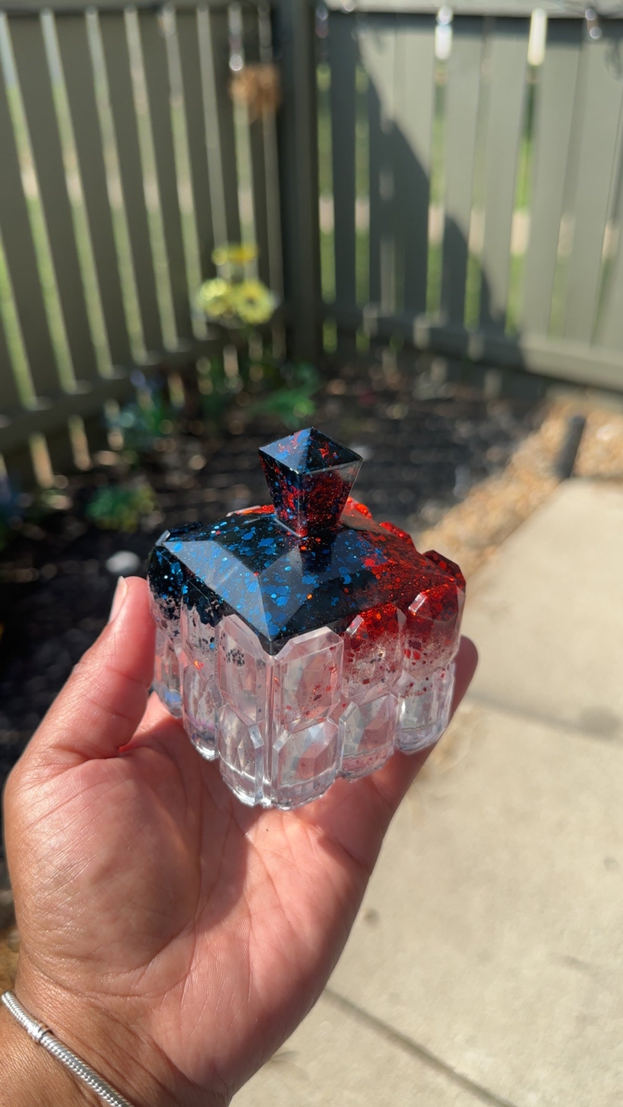 Add a touch of bold elegance to your space with our Patriotic Prism Diamond Jar, a handmade resin creation that beautifully blends artistry and functionality. Designed with a stunning double diamond-studded lid, this jar features a striking mix of shimmering red and blue glitter cascading into a crystal-clear base. Perfect for storing jewelry, keepsakes, small trinkets, or simply displaying as a statement piece, this jar captures both sophistication and uniqueness. Each piece is one-of-a-kind, making it a dazzling addition to your collection or the perfect gift for someone special.