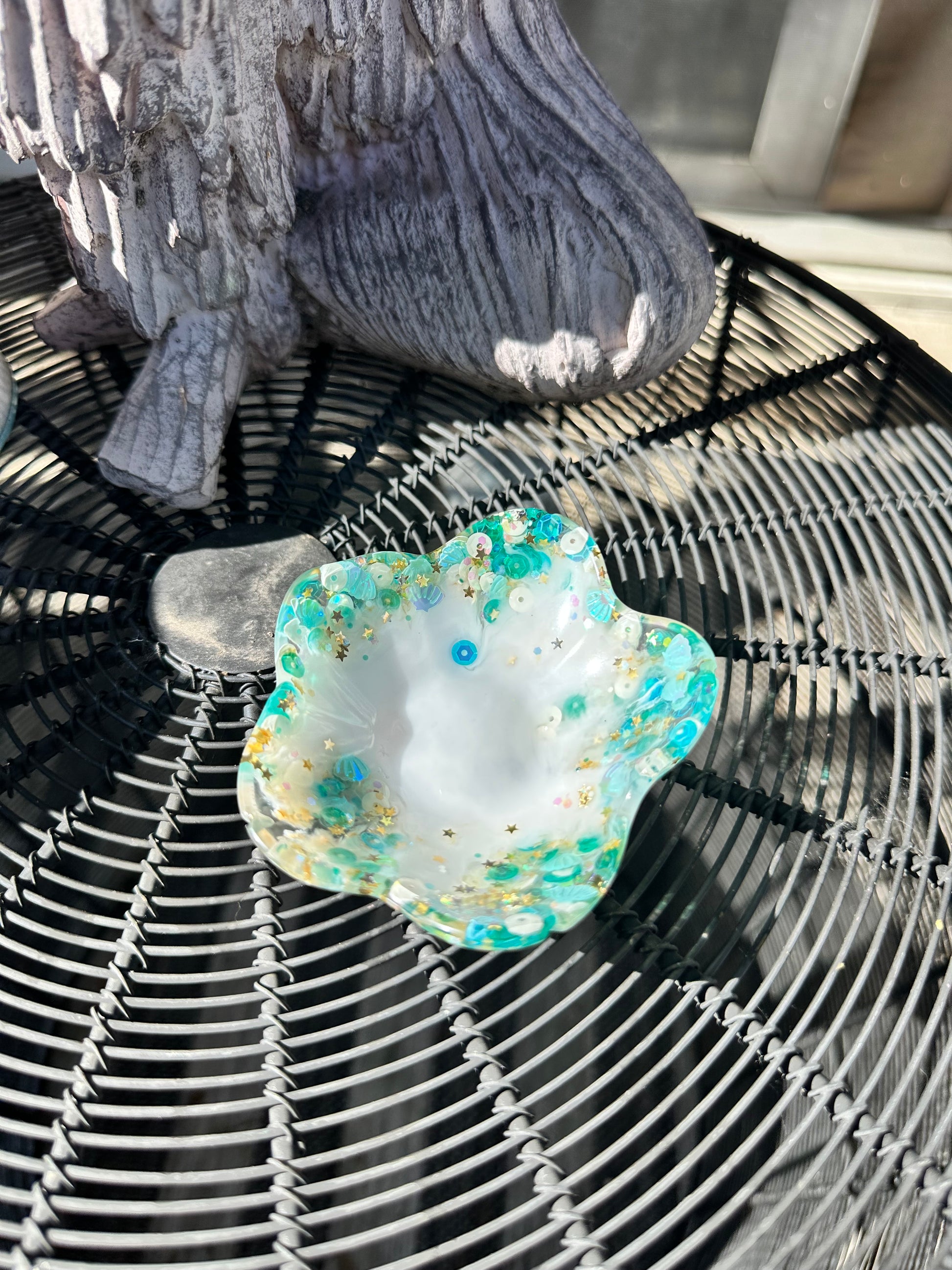 Expertly crafted, the Star dish is a stunning addition to any home decor. Handmade with delicate white pigment, glittering gold stars, and accented with sea shells and pearls, this dish is a unique and elegant piece. Perfect for displaying trinkets or as a standalone piece, it adds a touch of sophistication to any space.