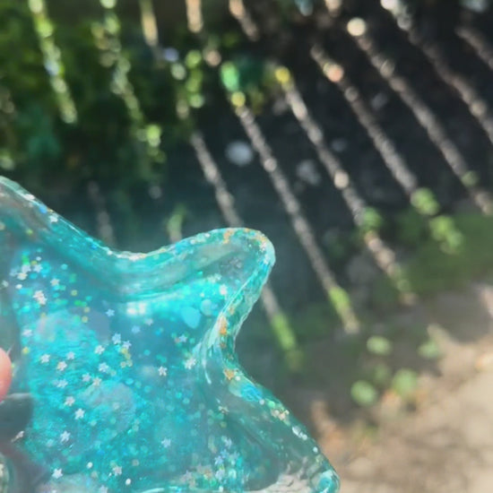 Expertly handcrafted with shimmering teal alcohol ink and golden glitter accents, our Starfish Dish is the perfect addition to your coastal-inspired home decor. Its intricate design features delicate starfish and seashells, adding a touch of sea-worthy charm to any room. Bring the tranquil beauty of the ocean into your home with this unique and beautiful dish.