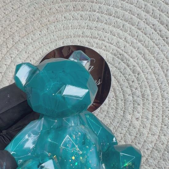 Expertly handmade, Twinkle Bear is a majestic addition to any collection. Featuring a stunning teal color and shimmering glitter, this bear is sure to catch the eye and bring a touch of charm and elegance to your space.