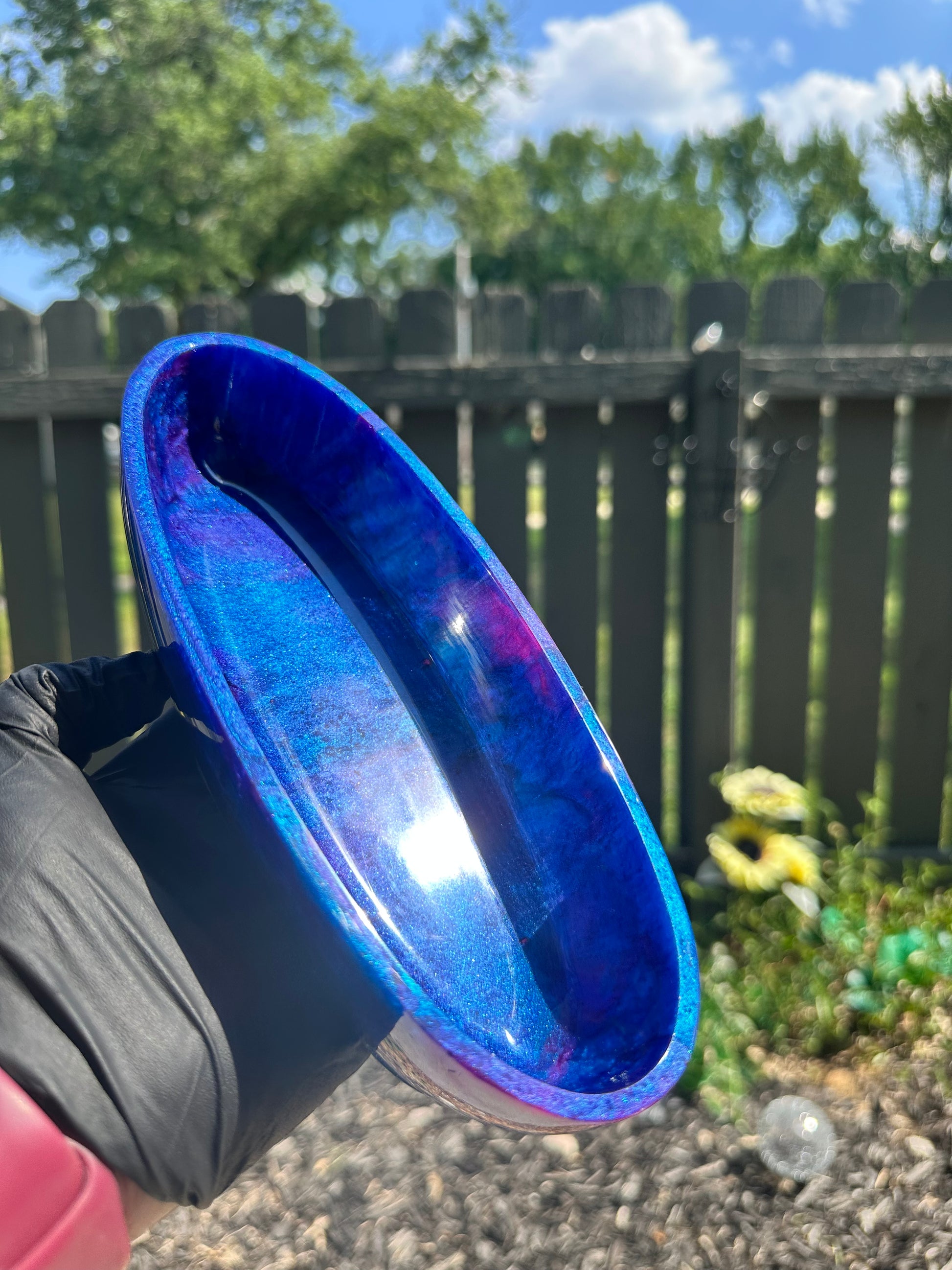 Bring a touch of cosmic beauty to your space with our handmade Midnight Galaxy Trinket Dish. Featuring swirls of deep blue and rich violet, this resin piece captures the allure of a starlit sky, perfect for holding jewelry, keys, or your favorite small treasures.